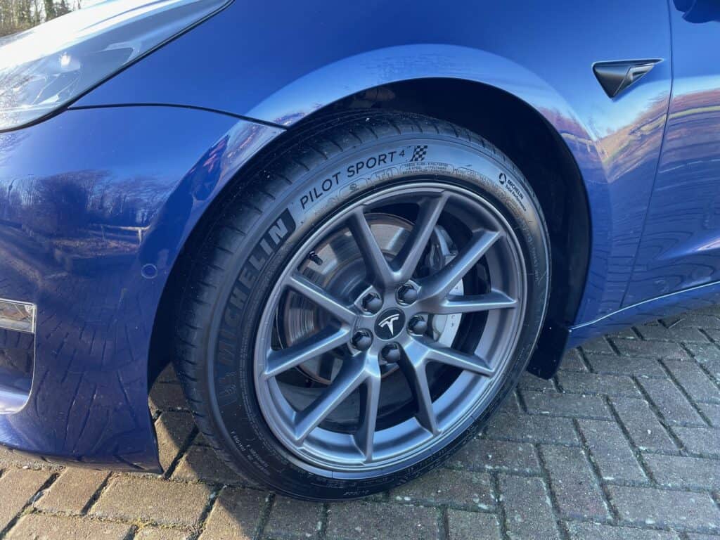 Just fitted four new Michelin Pilot Sport 4 Acoustic tyres, which are recommended for the Model 3. All four wheels have been refurbished in the factory colour, and a set of four genuine Tesla TPMS (tyre pressure monitoring system) sensors has been installed. As well as a fresh 12-month MOT.